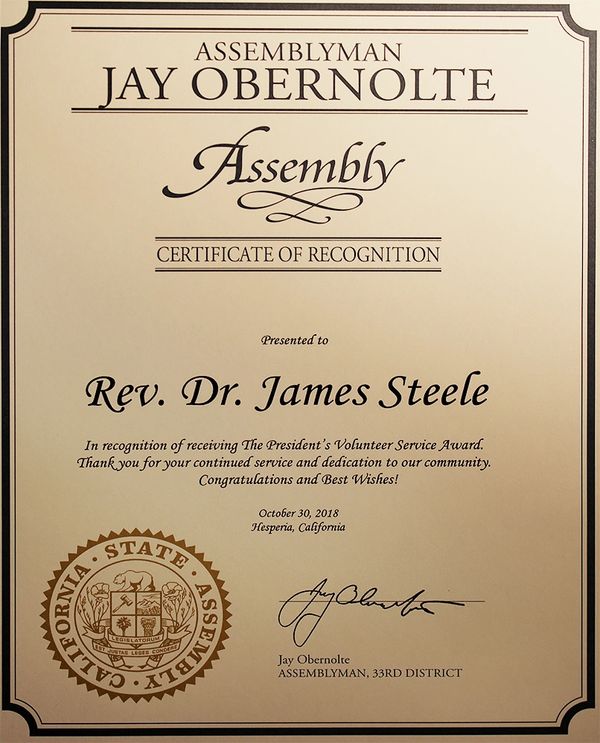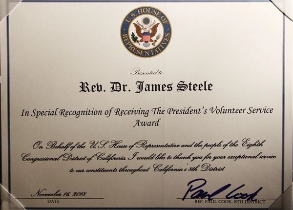 Many certificates have been bestowed on Fr. James for his volunteer efforts both locally and nationally, including one from President Trump for “Volunteer of the Year 2018.”