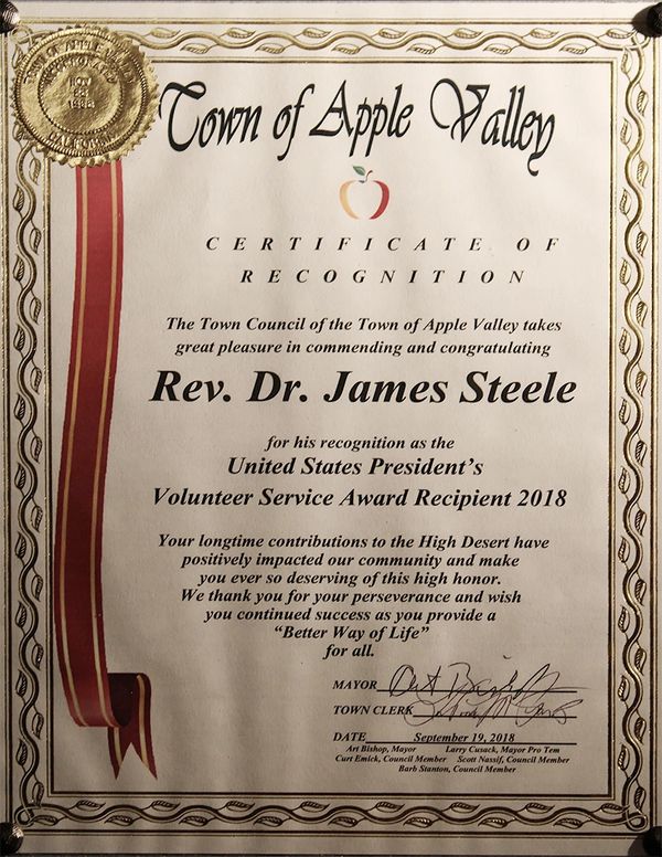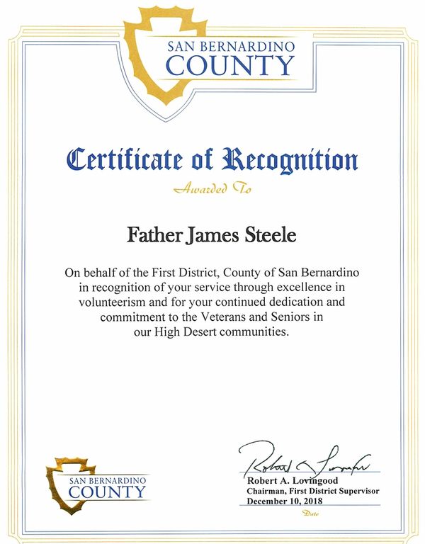 Fr. James Steele is honored by the Apple Valley Town Council for his volunteer work in the local region.