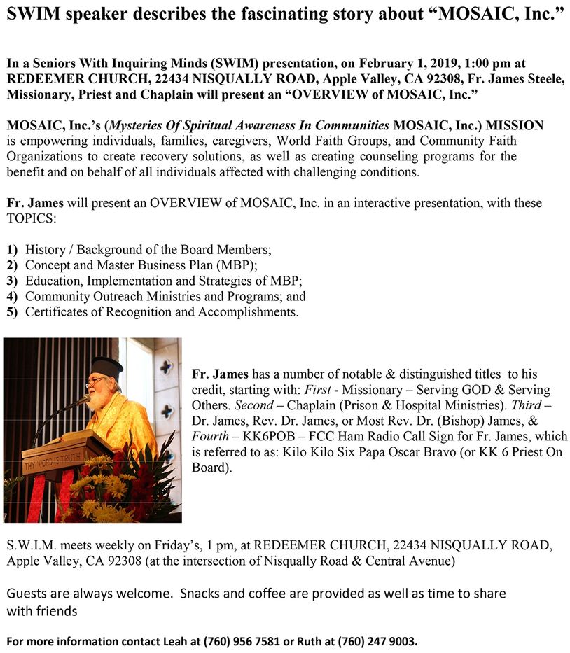 Fr. James will be speaking at the Friday, Feb. 1 meeting of SWIM (Seniors With Inquiring Minds), at 1pm at Redeemer Church, 22434 Nisqualli Rd., Apple Valley, CA 92308.