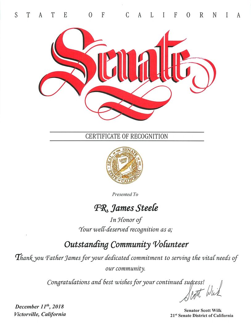 Senator Wilk presents Fr. James Steele with a certificate in recognition of his community volunteer efforts.