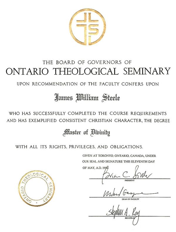 Ontario Theological Seminary, CAN., (GPA 3.731), May 1995