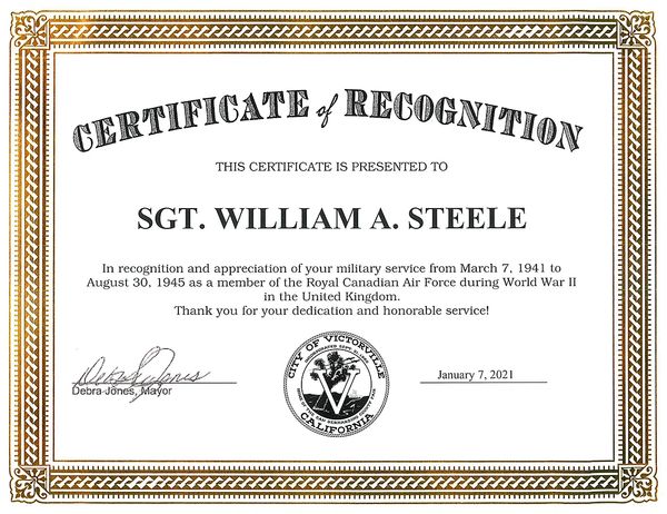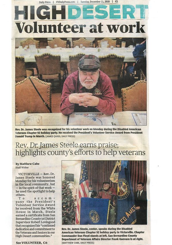 To accompany the President’s Volunteer Service Award he received from the White House in March, Steele earned a certificate from San Bernardino County 1st District Supervisor Robert Lovingood that recognized his “continued dedication and commitment to the Veterans and Seniors in our High Desert communities.”